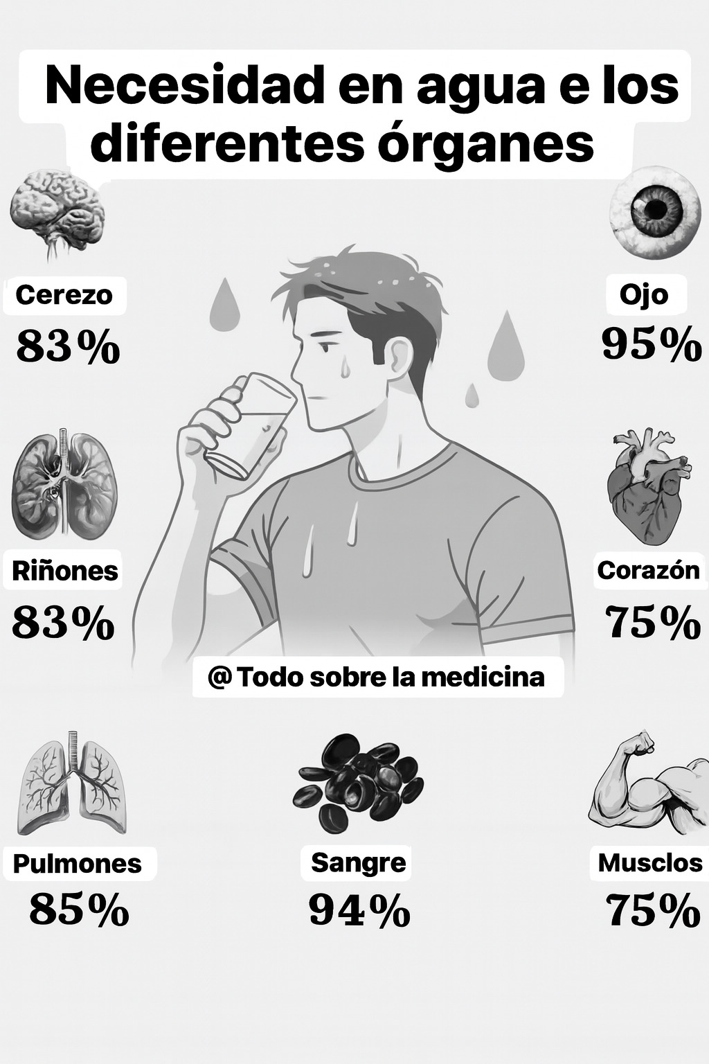 Aquí está el porcentaje de agua en diferentes órganos:✅ Cerebro 🧠 – 83 % de agua✅ Ojos 👀 – 95 % de agua✅ Riñones 🚽 – 83 % de agua✅ Corazón ❤️ – 75 % de agua✅ Pulmones 🌬️ – 85 % de agua